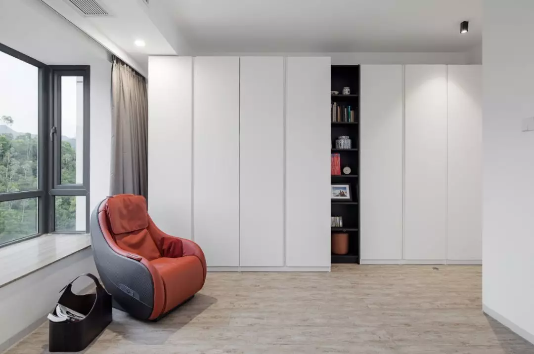 在大面積溫潤中和的暖木調地板中,干凈利落的一片式衣柜,顯露出與眾不同的個性。設計師通過減少過多繁雜的室內包裝設計,讓空間看起來更舒服簡潔,并且更有整體性。