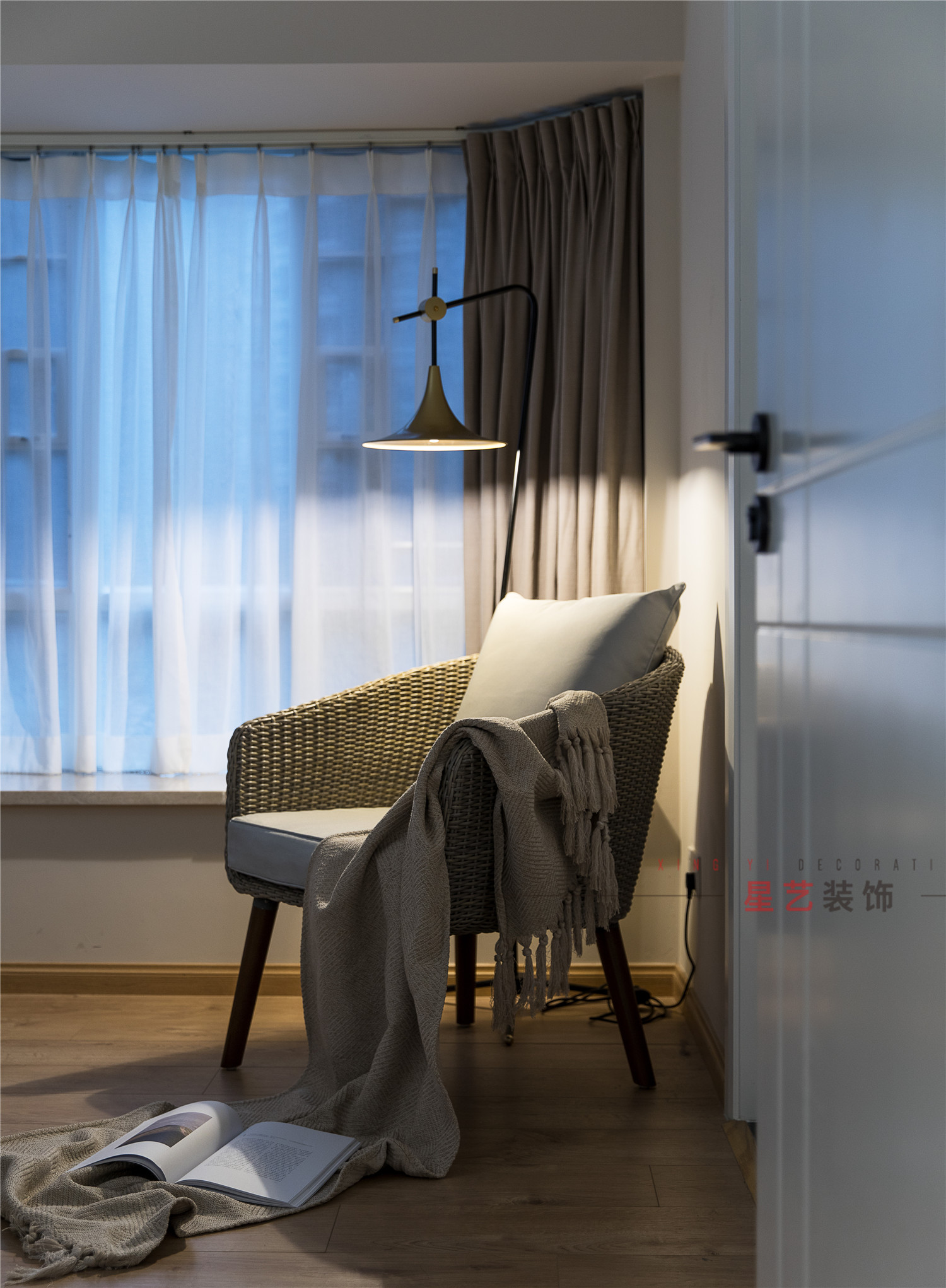 業主平常非常喜歡看書,提高自身修養,所以設計師特地在兩邊床頭位置設置了小書柜,回家后也可以在窗邊的藤椅上休息,看太陽落山,日暮降臨,沉浸在自己的小世界里,以最好的狀態迎接每一天。