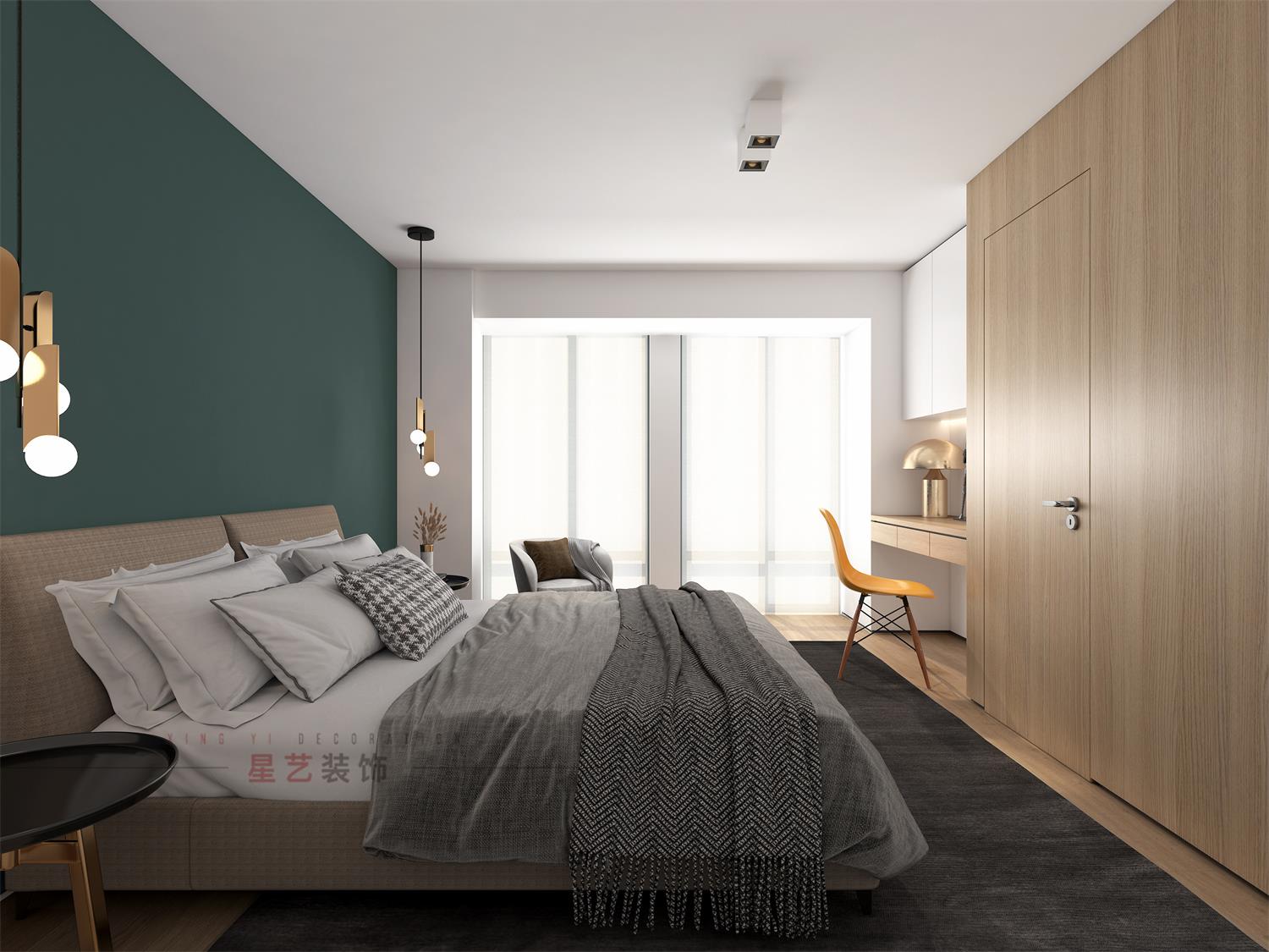 走進臥室,暗綠色的墻面放上海洋元素的掛畫,一瞬間好像進入了海底森林,去探尋生命的意義。筆直的時尚吊燈和墻面讓臥室的精致度得到大幅提升,橘色的窗簾也讓暗色的空間眼前一亮。