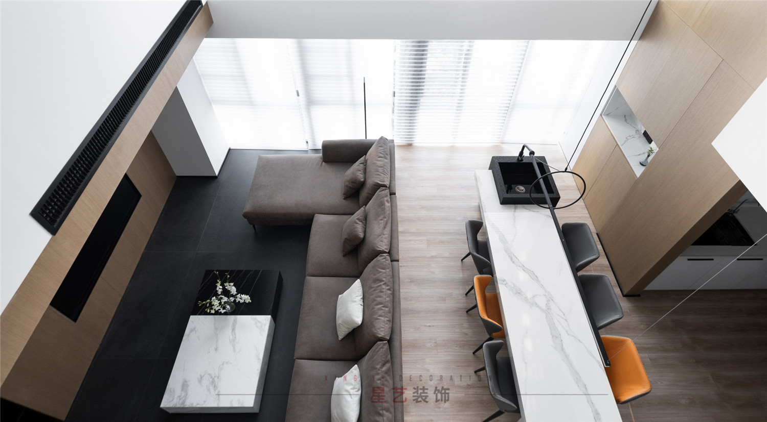 從二樓俯瞰視角就能明顯的發現,客廳的整體的設計非常靈活,根據時間變化的光影效果能營造出各種美輪美奐的夢幻空間。