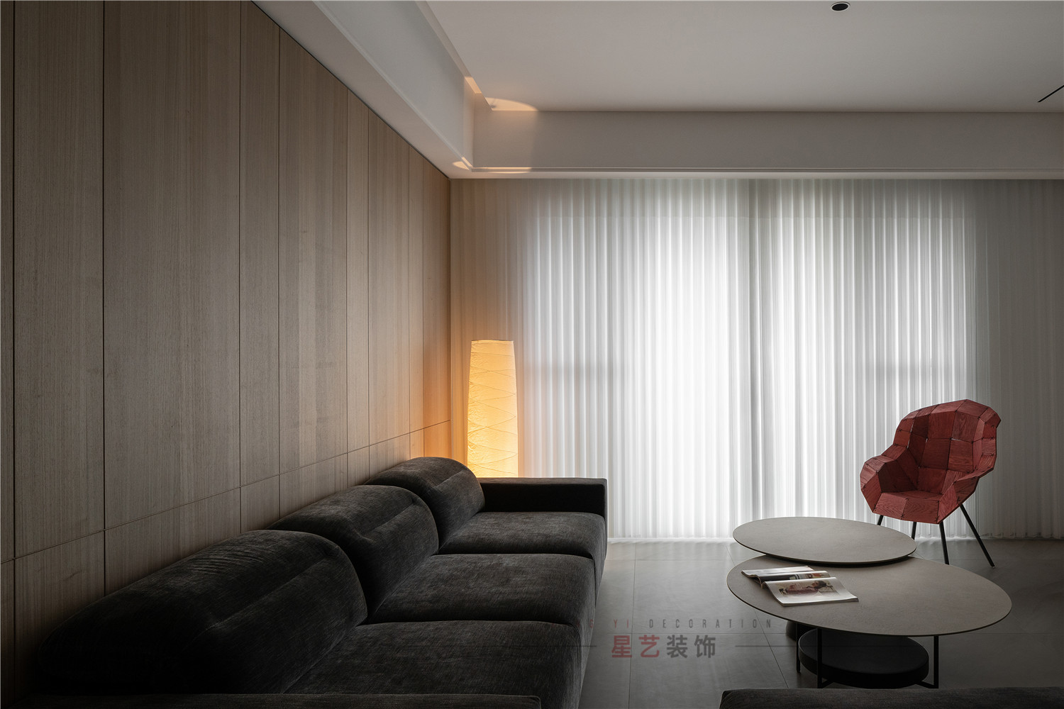 帶有獨特設計的紅椅像把火點亮了整個空間,小小的點綴卻也是獨具匠心的設計。窗邊的落地暖黃燈光照亮了這大面積深色的環(huán)境,似冬日的暖陽給人溫暖,獨自發(fā)光發(fā)熱。