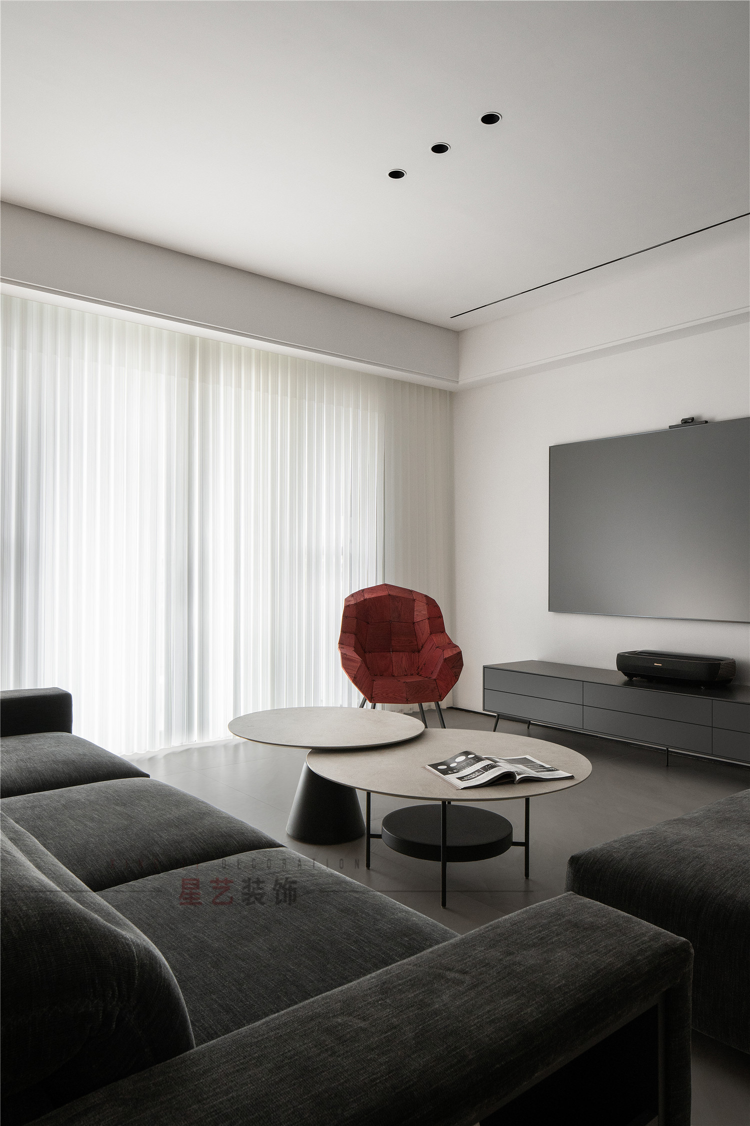 客廳是經典的黑白灰設計,極簡風格盡顯高級大氣,柔軟舒適的絨面深色沙發(fā)搭配拼接圓桌,簡約精致又賦予時尚魅力,整體上僅用色彩的沖擊與家具的質感展現設計的精妙。