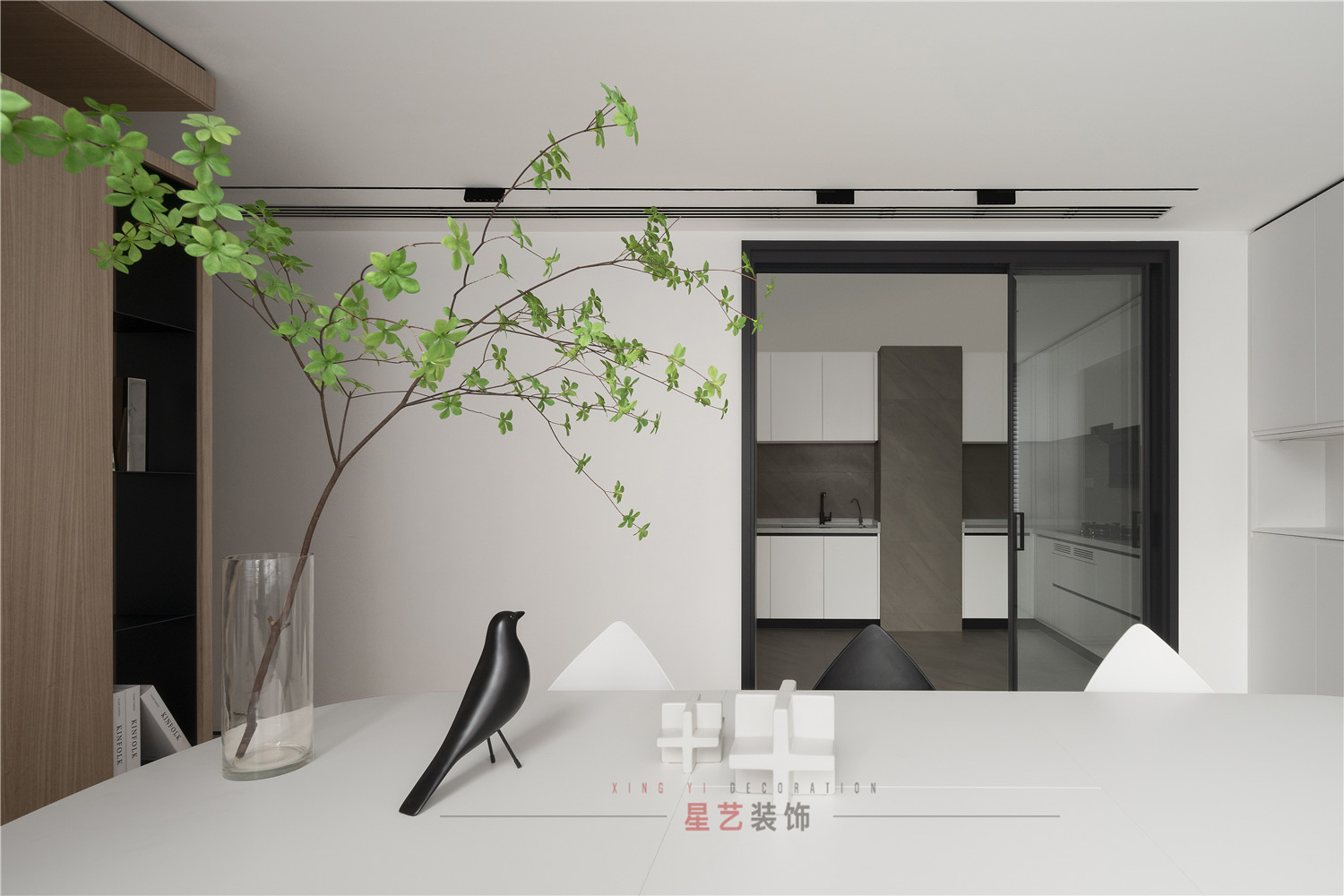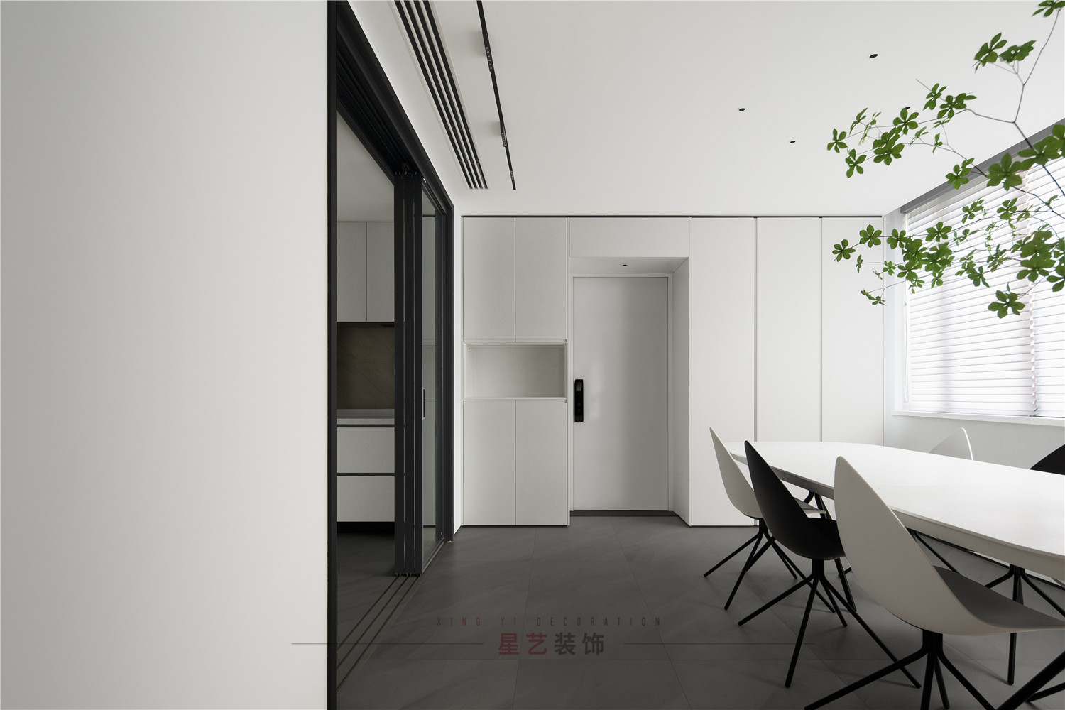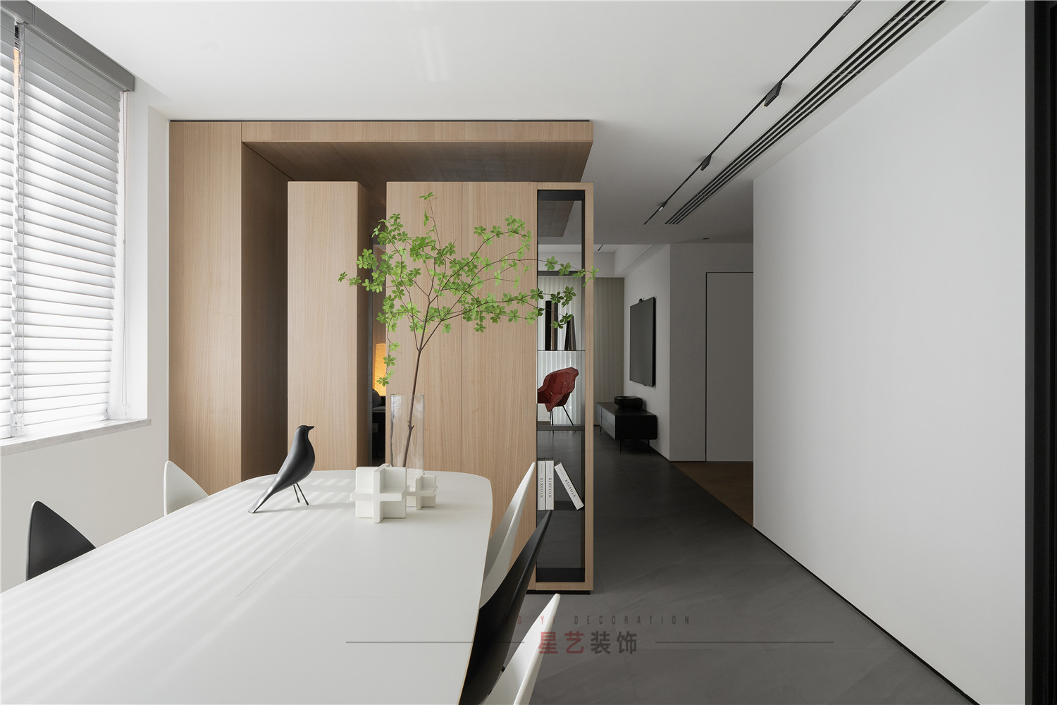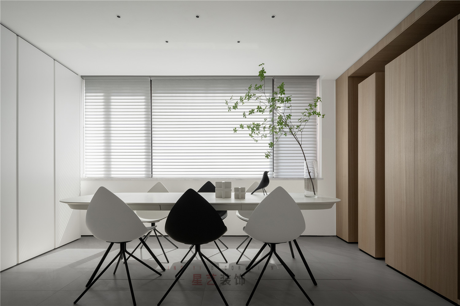 餐廳部分清新明亮,大面積的百葉窗與白色儲物柜在視覺上延伸用餐區(qū)的空間,黑白相間的桌椅虛實結合,讓整個空間有了沉穩(wěn)的底色,像是化雪后清晨,迸發(fā)勃勃生機。