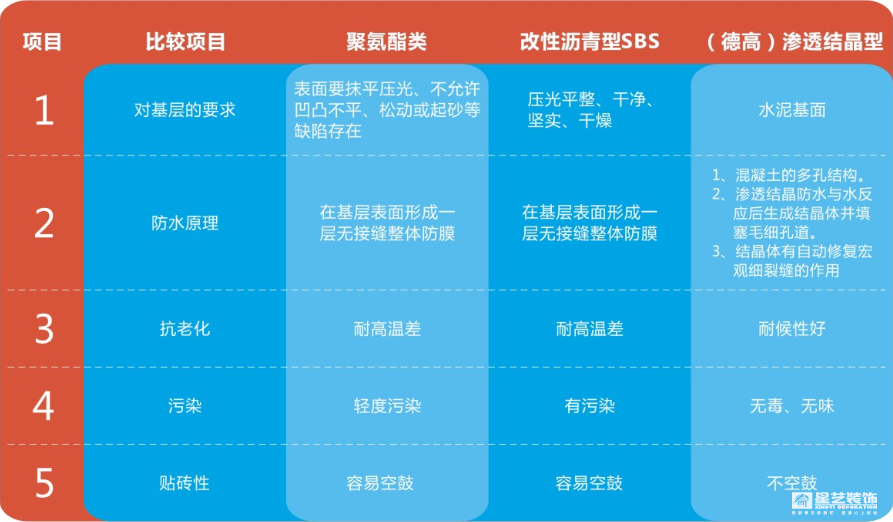 各種防水涂料性能比較